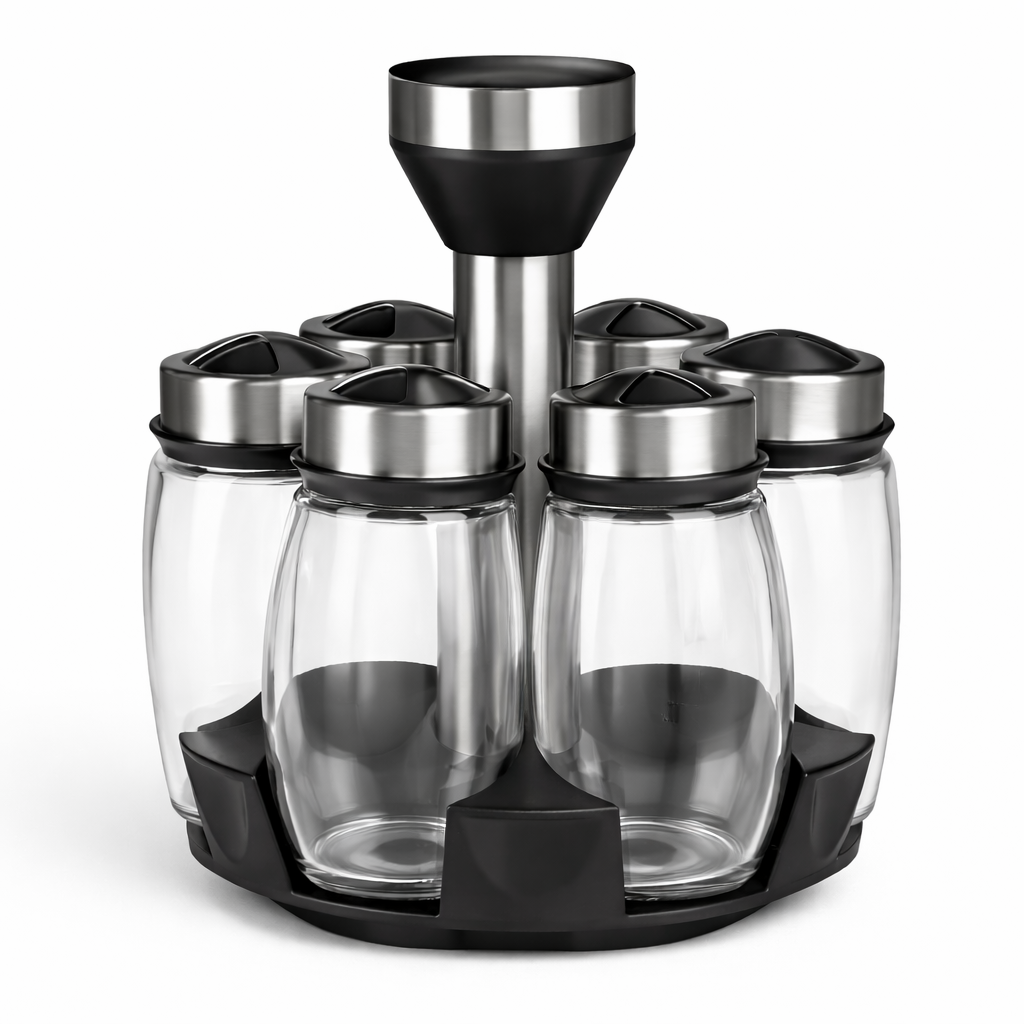 O Conjunto de Porta-Temperos em Vidro com Suporte é perfeito para manter seus temperos sempre organizados, visíveis e ao alcance das mãos, trazendo praticidade e um toque moderno para a cozinha.